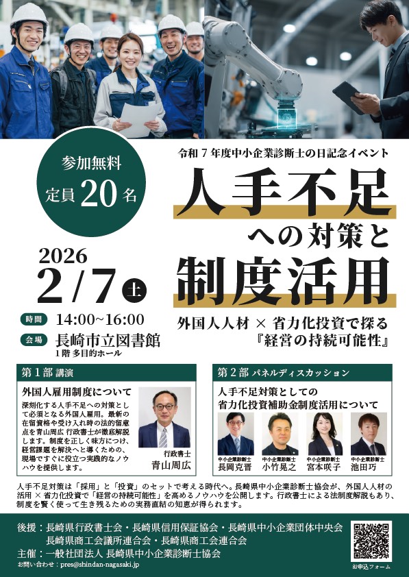 「令和7年度 中小企業診断士の日記念イベント」として、人手不足という多くの中小企業が直面する課題をテーマに、外国人材の活用や省力化投資など、制度を上手に活かした実践的な対策について学ぶセミナーを開催します。